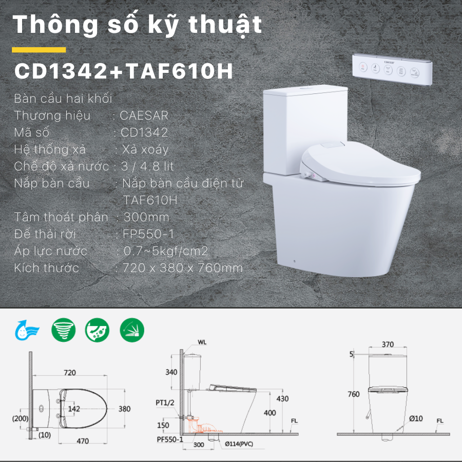 Bàn cầu kết hợp nắp điện tử CD1342 - TAF400H